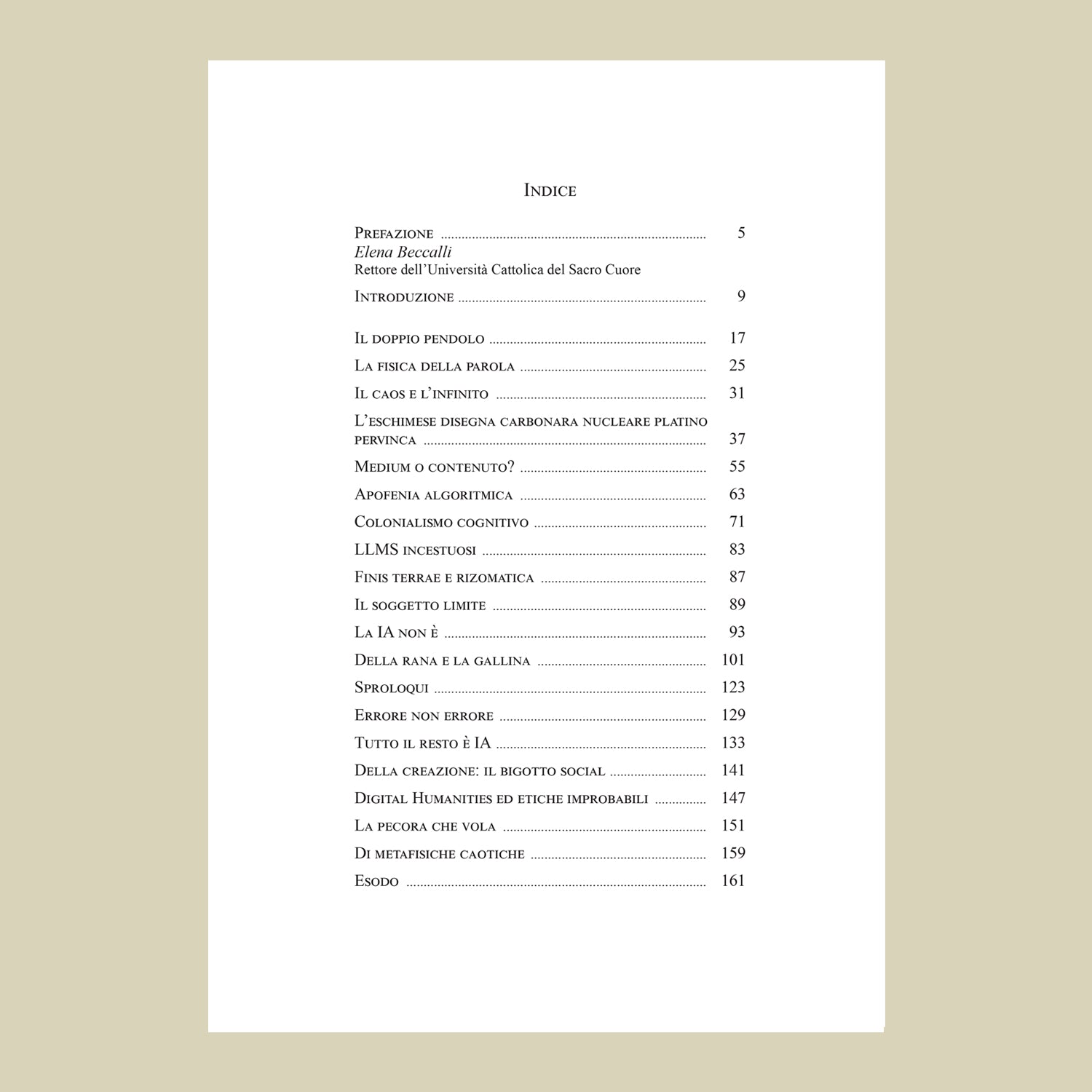 Dalla prefazione: "Il libro esplora, con un suggestivo linguaggio visivo, i molteplici ambiti nei quali l’IA sta producendo i suoi effetti con il tratto tipico di un artista poliedrico quale è l’autore. Un’opera che ci porta a “toccare con mano” la libertà del caos. Volendo indicare una chiave di lettura che ritengo possa essere utile per accostarsi alle pagine che seguono, non ho difficoltà nell’individuarla in quella che lega IA e questione antropologica."